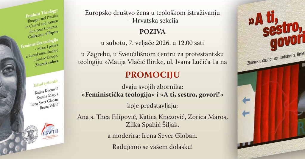 U organizaciji Hrvatske sekcije Europskog društva žena u teološkom istraživanju (ESWTR – CS) u subotu 7. veljače na Sveučilišnom centru Matija Vlačić Ilirik Sveučilišta u Zagrebu predstavljena su dva zbornika izuzetne važnosti za feminističku teologiju i teologiju uopće: „Feminist Theology: Thought and Practice in Central and Eastern European Contexts – Collection of Papers / Feministička teologija – misao i praksa u kontekstima srednje i istočne Europe – Zbornik radova“ (ur. K. Knezović – K. Magda – I. Sever Globan – B. Velčić; Zagreb, 2025.) i „A ti, sestro, govori!“ (ur. A. Th. Filipović – K. Knezović – K. Magda – I. Sever Globan; Zagreb, 2025.).