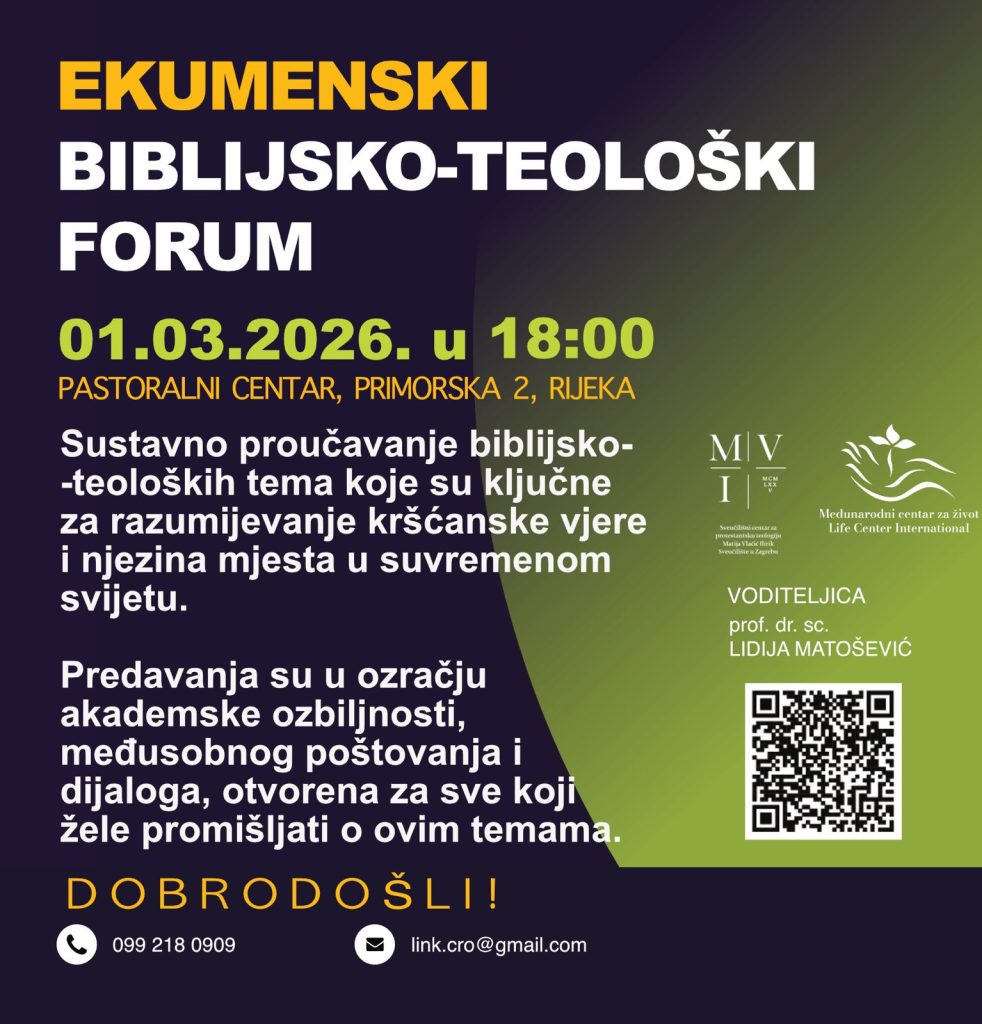 U Rijeci 1. ožujka 2026. u 18 sati počinje Ekumenski biblijsko-teološki forum, program sustavnog proučavanja biblijsko-teoloških tema važnih za razumijevanje kršćanske vjere i njezina mjesta u suvremenom svijetu.